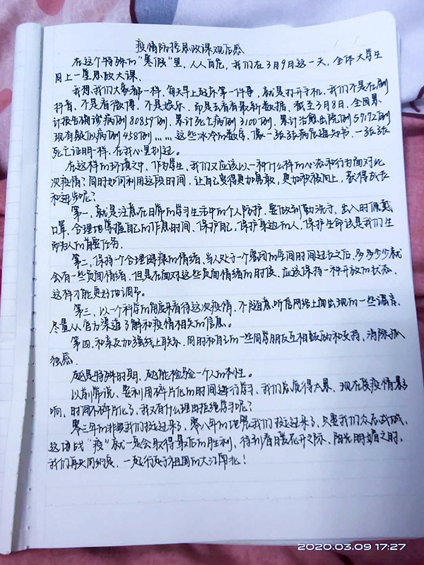 网课结束后,各分院系组织学生对本堂思政大课进行热烈讨论并在课后撰写了观后感。同学们纷纷表示,在此次疫情防控中感受到中国共产党对国家坚强有力的领导。连日来,新冠肺炎疫情防控形势持续向好、生产生活秩序加快恢复、国际社会对中国此次疫情防控的有力举措给予高度评价,这些也体现了中国的“大国风范”和“大国担当”。