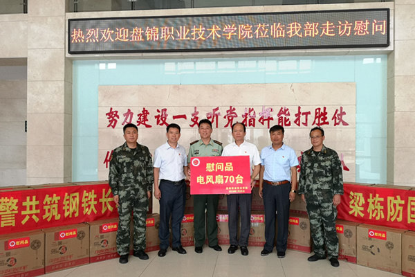 7月25日上午,在八一建军节到来之际,学院武装工作部走进驻盘锦武警部队进行慰问。此次慰问活动由学院党委副书记、武装工作部部长李兵带队,学生工作处处长、武装工作部副部长邓红伟,武装工作部专干王俊杰老师,学生工作处舒峻峰老师和建筑工程分院辅导员李长福老师共同参加此次慰问活动。
