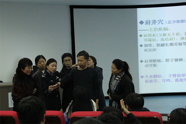 李主任结合大量案例,围绕现场紧急救护知识、室内污染的危害及防护、环境污染(雾霾天气)的危害及防护、慢性职业病防治、呼吸道疾病预防、经络穴位养生等多个方面做出了精彩的讲述,并就如何对身体进行检测以及穴位按摩等方面进行了现场示范。李主任的讲授形象生动、风趣幽默,大家时而凝神静听,时而会心一笑,在轻松愉快的现场氛围中积极参与互动,将整场气氛推向高潮。