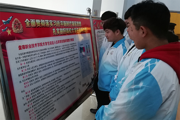 会上,学生工作处处长、武装部副部长邓红伟宣读了《盘锦职业技术学院大学生应征入伍优惠政策暂行规定》;武装部干事王俊杰公布了《盘锦职业技术学院2018年征兵宣传活动实施方案》;石油工程系林祥同学代表退役复学大学生发言。