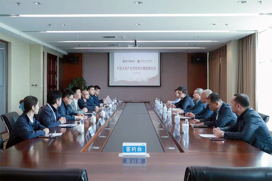 2023年5月9日下午,学校党委书记、校长王首中,副校长李辉等一行到辽宁中蓝电子科技有限公司举行“中蓝光电产业学院”签约仪式。辽宁中蓝电子科技有限公司董事长王迪、副总裁陈军热情接待到访一行,双方就促进友好交流、推动合作办学等进行深入会谈。
