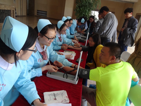 本次庆祝活动共分为测量血压,血糖等义务活动、授帽仪式、“天使风采”文艺演出等三大部分。测量血压、血糖等义务活动于5月12日中午在我院的第一食堂和教工食堂进行,由医疗护理分院的部分老师和同学们身着整洁的护士服,手拿测试仪器和记录单为部分师生进行血压、血糖及身高体重等项目的测定,并热心的对同学们进行了健康知识的宣传和讲解。一群衣着整洁的白衣天使,像一朵朵竞相开放的花儿,成为了校园内一道亮丽的风景线。