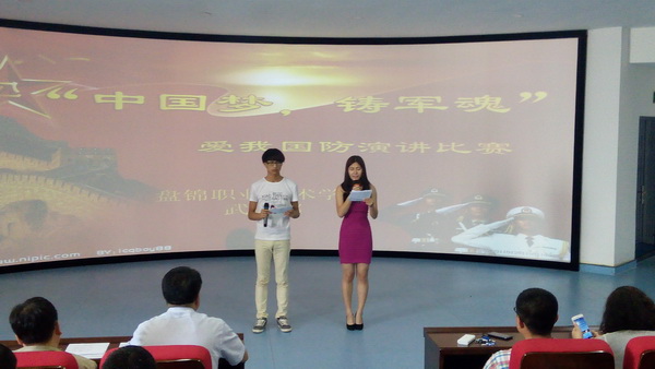 为全面做好我院2015年大学生征兵宣传动员工作,落实辽宁省大学生征兵办公室文件精神,积极响应国家号召,鼓励全院大学生报名参军,5月22下午12点30分,在博远楼103报告厅举办了主题为“中国梦,铸军魂”爱我国防大学生演讲比赛。学院学生工作处、武装部、各分院系的领导、老师和学生代表参加了此次活动。