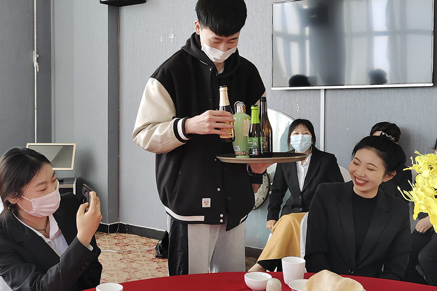 实训第二天,主要由胡文静老师带领同学们进行了前厅接待礼仪、中餐接待礼仪以及西餐接待礼仪的实训。实训以工作过程为导向,同学们全程模拟前厅及中、西餐顾客接待流程,并重点学习了引客入位、托盘斟酒以及餐厅铺台等礼仪技能,同学们学习兴趣浓厚,收获满满。