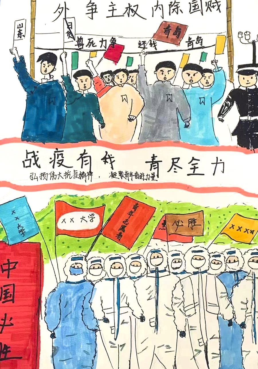 为期一周的“云”端授课过程中,各位教师利用腾讯会议、学习通直播两大网络平台,在充分发挥学生主体性的基础上,紧扣抗疫主题,利用传唱抗疫歌曲、绘制抗疫手抄报、拍摄抗疫短片等多种形式推动思政课实践教学提质增效。通过沉浸式的思政课实践教学,使学生重温抗疫过程中的感人场景,体会在抗击新冠疫情过程中彰显的制度优势,感悟伟大抗疫精神的内涵和力量,有利于鼓励学生在担当中历练,在尽责中成长,帮助学生立大志、明大德、成大才、担大任,助力学生扣好人生的第一粒扣子。