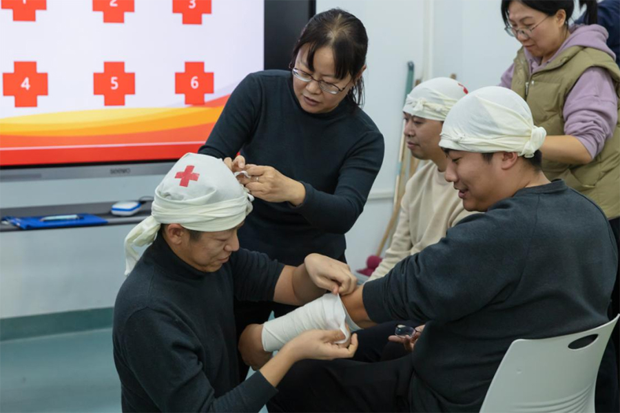 本次培训由盘锦市红十字会应急救护师资服务队孙靖涛老师主讲,内容涵盖了急救基础知识、心肺复苏术(CPR)、AED(自动体外除颤器)的正确使用方法以及多种包扎技巧等。