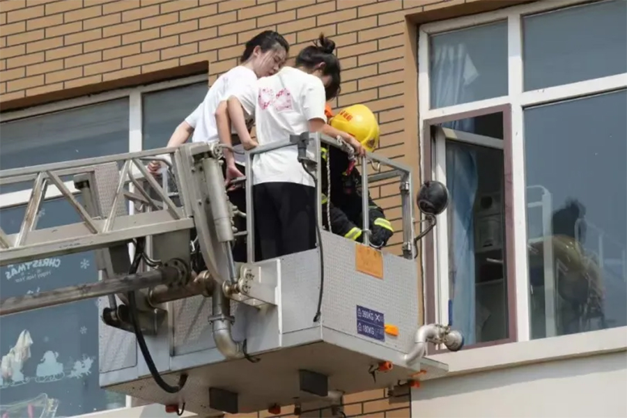 在救援环节,辽东湾新区消防救援大队出动云梯车搭建“空中生命通道”,内攻小组与搜救小组协同配合,成功营救3名“被困”学生。演练还设置医疗救援场景,盘锦市红十字应急救护服务队现场演示止血包扎、心肺复苏等急救技能,强调“黄金四分钟”救援原则,指导师生掌握“快、准、轻、牢”的包扎要领与“C-A-B”心肺复苏操作流程。