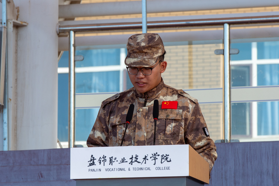 机电工程学院2025级新生张昊泽同学作为参训学生代表上台发言。他表示,军训是大学生活的第一课,不仅是体能的考验,更是意志的磨砺和精神的洗礼。他号召全体同学以军人的标准严格要求自己,服从命令,听从指挥,刻苦训练,以饱满的热情和昂扬的斗志迎接挑战,展现出盘锦职院学子的青春风采。