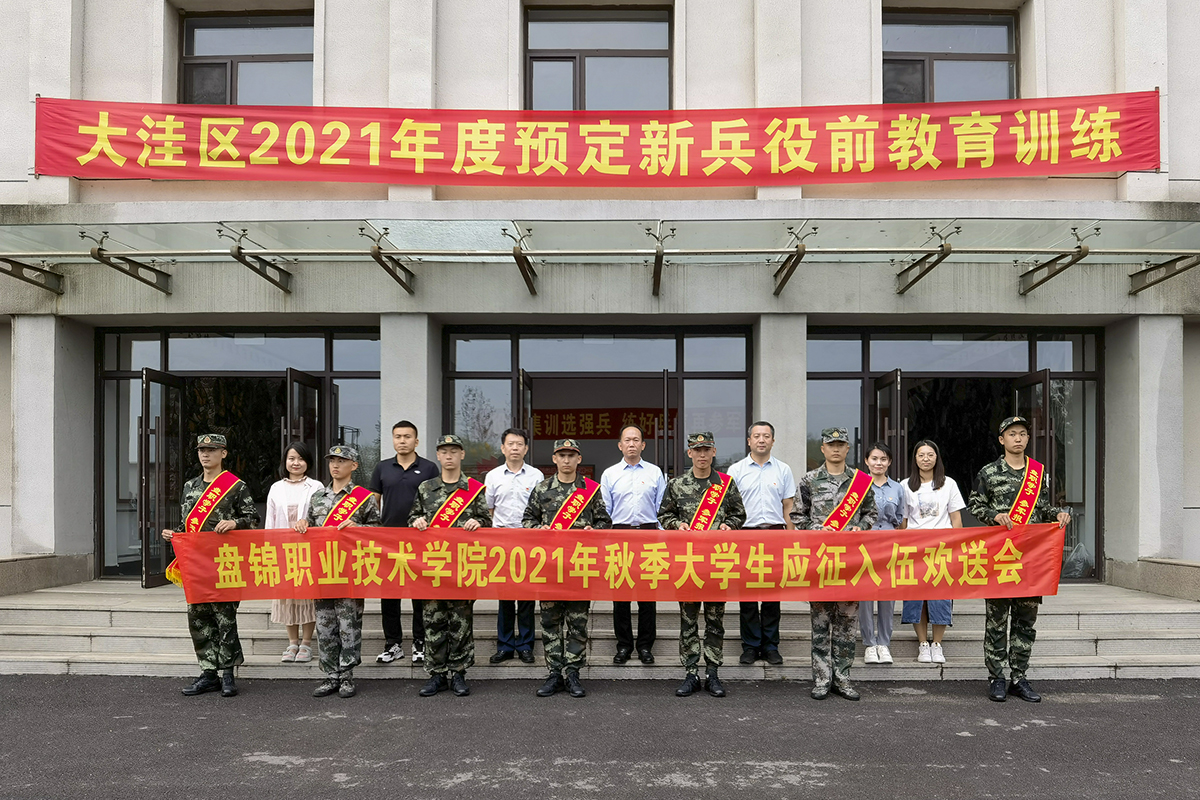 有为青年从军建功,热血青春立志报国。9月16日下午,学校武装工作部在大洼区人民武装部新兵集训地举行2021年秋季大学生应征入伍欢送会。学校党委副书记、武装部部长李兵,学生工作处处长陈平海,武装工作部王俊杰老师和相关学院的副书记及辅导员老师参加欢送会。会议由王俊杰老师主持。