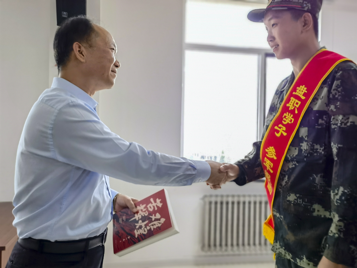 仪式上,7名新兵身着戎装,精神抖擞。同学们纷纷表态发言,回顾了美好大学时光,并讲述了在集训营训练收获,立志扎根军营,服从命令、听从指挥,努力学习军事技术,以实际行动报效祖国,不辜负学校老师、家长殷切嘱托,用青春与热血展现新时代军人风采,为祖国的国防事业贡献青春和热血。与会各位领导和老师们为入伍新兵佩戴了绶带,并赠送书籍《苦难辉煌》。