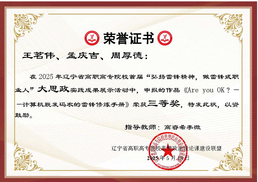 为深入贯彻习近平总书记在辽宁考察时的重要讲话和重要指示精神,大力弘扬辽宁“红色六地”文化,贯彻落实省委教育工委、省教育厅作出的《关于组织开展“弘扬雷锋精神,奋斗成就梦想”2025年春季学期“开学第一课”活动的通知》要求,在第62个学雷锋纪念日到来之际,辽宁省高职高专院校思想政治理论课建设联盟面向全省高职高专院校(包括本科院校高职专科)大学生开展了“弘扬雷锋精神 做雷锋式职业人”实践教学成果主题作品征集及展示汇报活动。活动历时两个多月,结果现已揭晓,我校选送作品喜获二、三等奖各两项。
