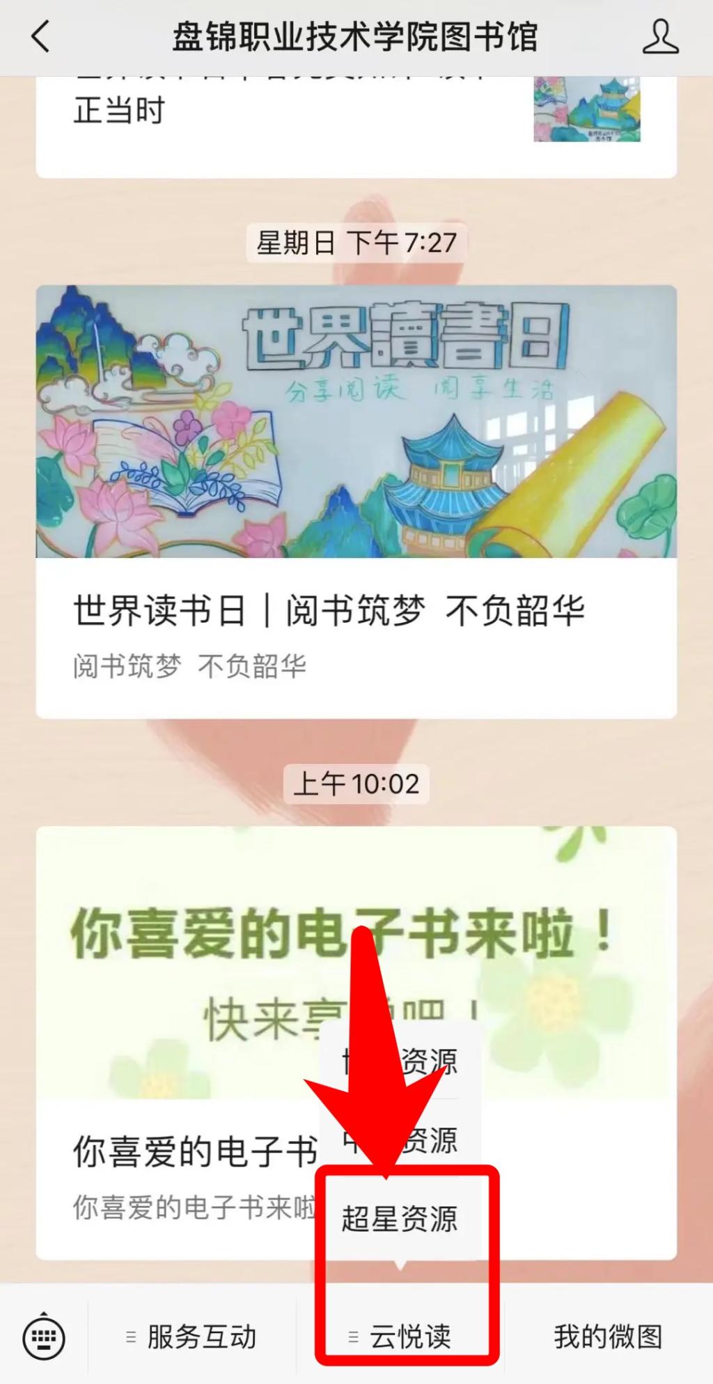 关注“盘锦职业技术学院图书馆”微信公众号,点击下方菜单栏“电子书”,点击“博看专区”进入,即可畅游书海。